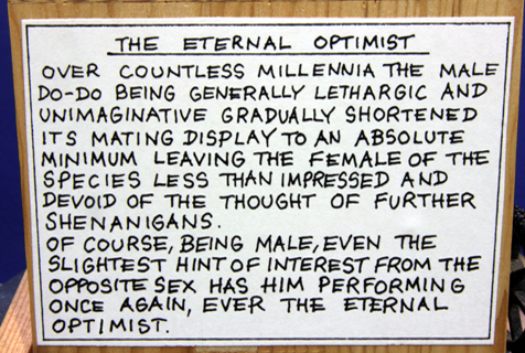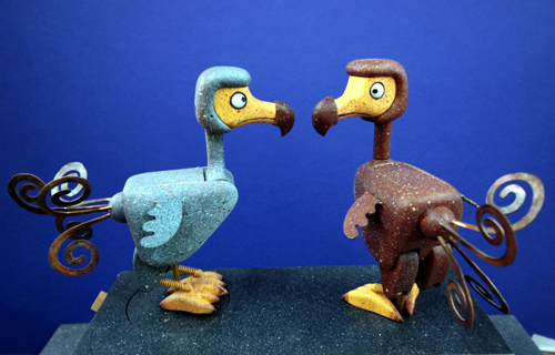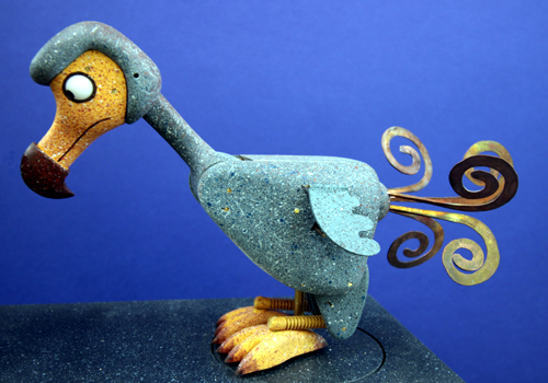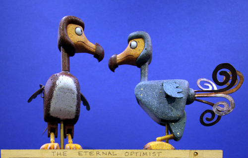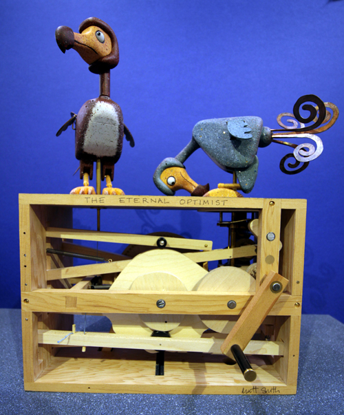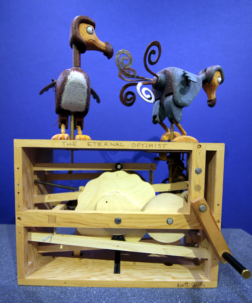 Here we have the latest automata edition from the Fourteen Balls Toy Company It's called " The Eternal Optimist " designed and made by me ( Matt Smith ) . It's constructed from my usual range of materials , Douglas fir , lime wood , Maple , brass Delrin , stainless steel and Dynemma string and finished in liquitex paint . The mechanism is fairly complicated and includes a clutch and a rotating turntable . The model is quite big being 250 mm x 120 mm x 340mm The Dodo's are 150 mm high. I won't describe it's sequence as it's better to watch the videos , here are the links to the videos VIDEO 1 VIDEO 2 The edition is available to order for delivery later in the year ( November or December ) The cost of the automata is £ 1,400.00 ( GBP) + delivery at cost |