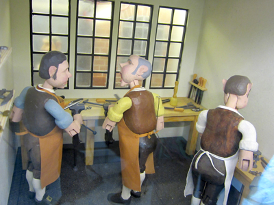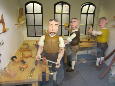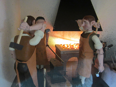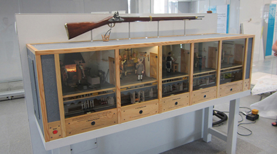 BIRMINGHAM MUSEUM AND ART GALLERY : PROJECT : To make a series of workshops showing the manufacturing processes of a flintlock rifle . A mechanical walking man visits each workshop in turn , as he walks into each workshop the scenes operate . Click here for a video. g |