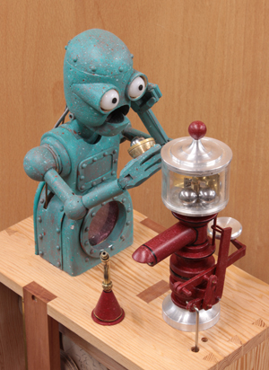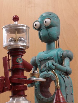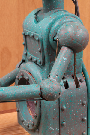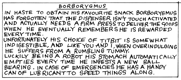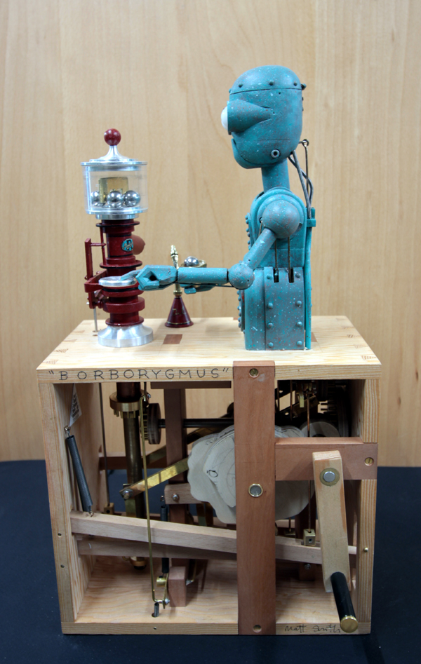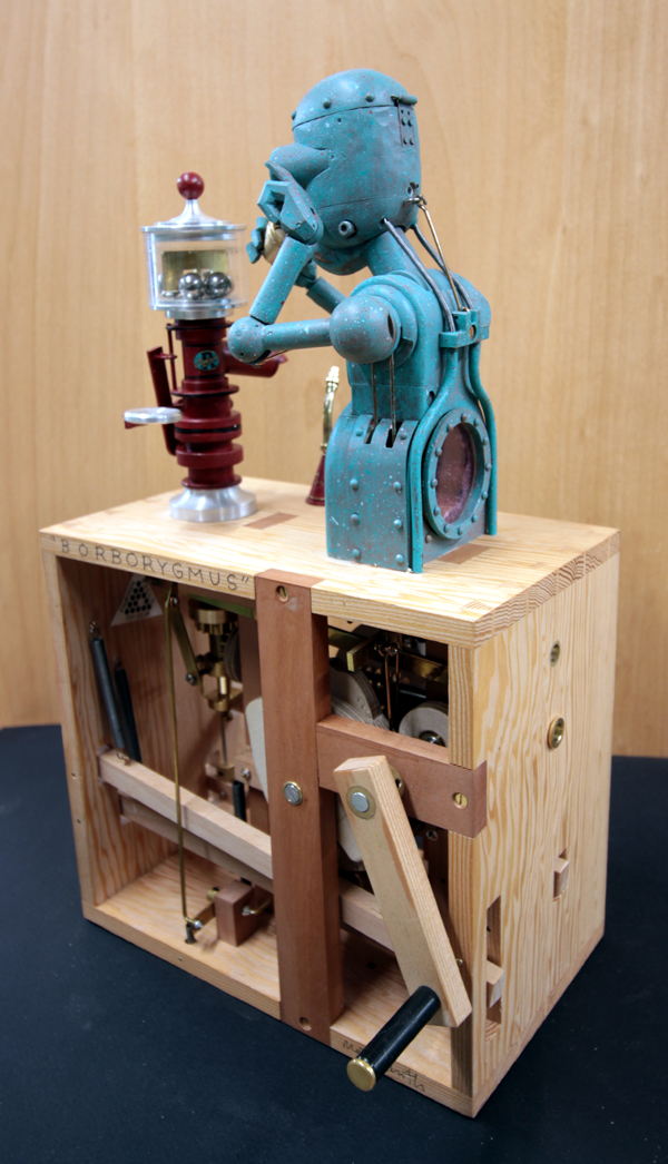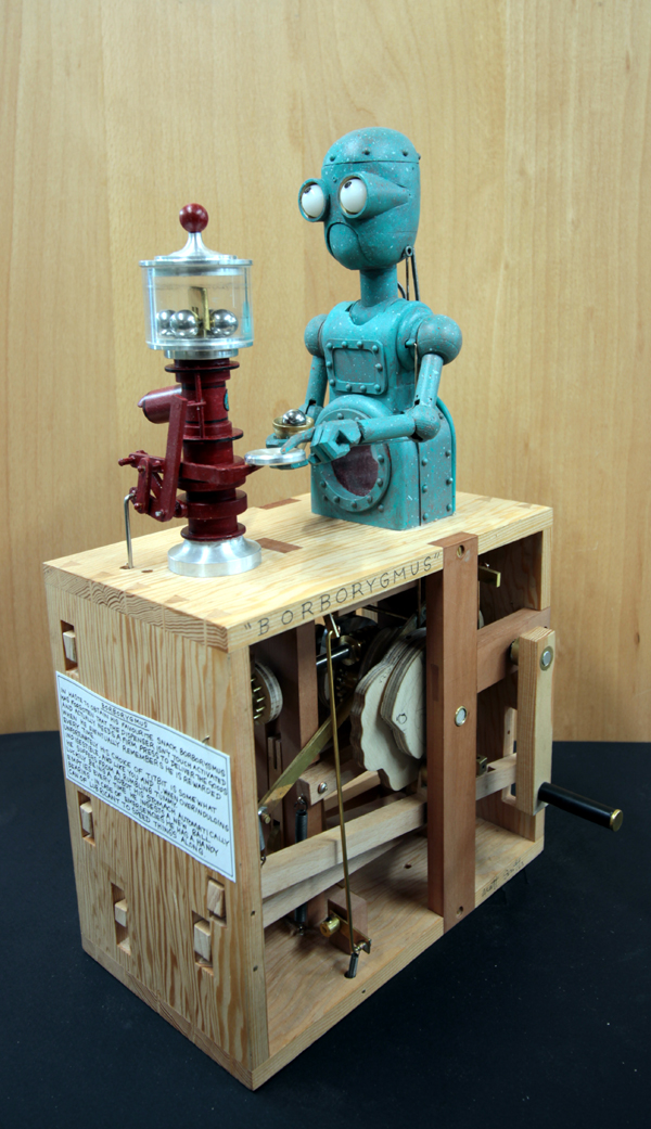 ![]() ACTION : Whilst the balls are continiously churned in the snack dispenser's hopper Borborygmus attempts to release a ball by touching the lever . He does this twice and then scratches his head. The third time he presses the lever and looks down as the arm on the dispenser rotates to deliver a ball to his cup. Borborygmus leans forward and the arm on the dispenser rotates out of the way , he then lifts his arm up and tips the ball into his mouth , as he does so he looks up then swallows the ball . The ball is transfered to his stomach where it is churned for a while before being released by a trapdoor back into the dispenser. The whole process begins again. MATERIALS : There are a whole variety of materials used in the constrction including : Dogulas Fir, Swiss pear, Maple, Beech, Lime , Brass , Bronze , Phosphor Bronze , copper , Aluminium , Stainless steel , Delrin , Perspex, PTFE etc.... Dimensions 320 mm x 190 mm x 100 mm ( 13" x 7.5" x 4" ) . VIDEO 1 VIDEO 2 |