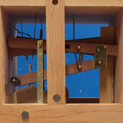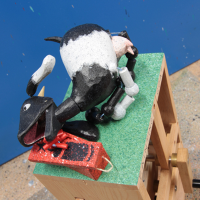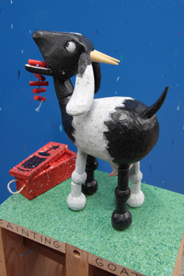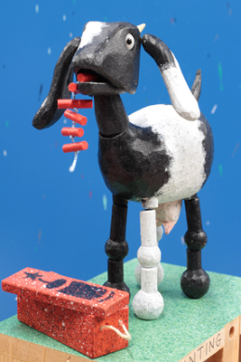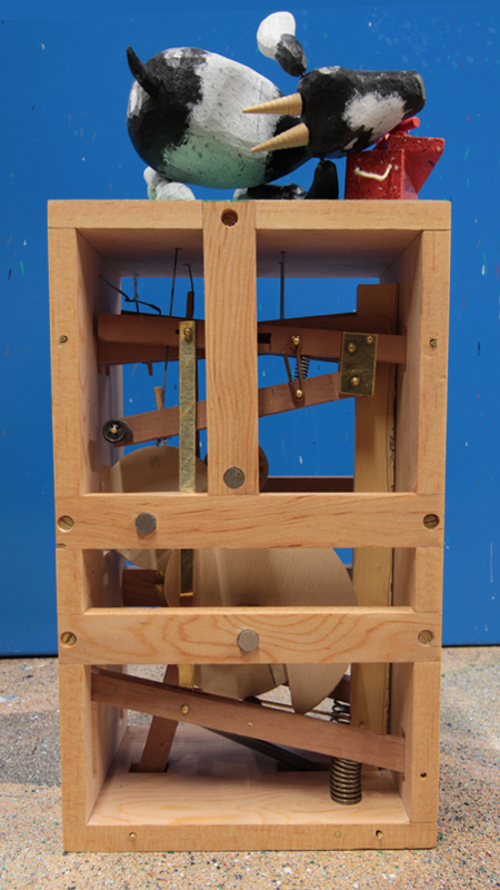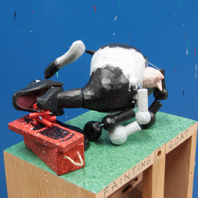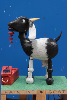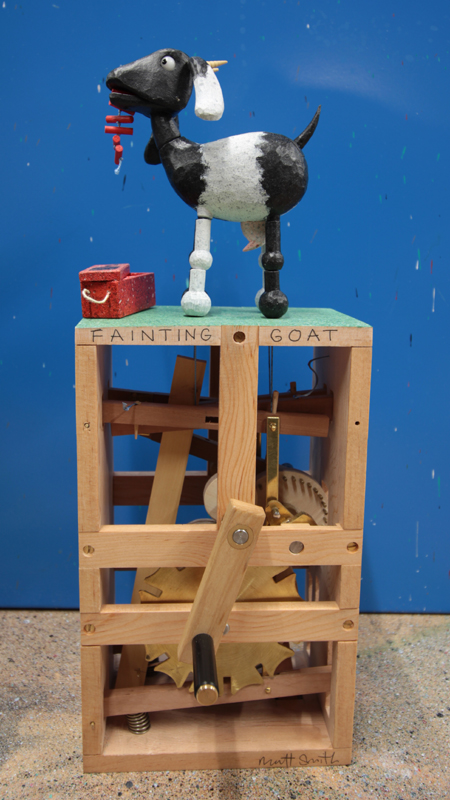 designed and made by Matt Smith . The fainting goat or Myotonic goat has a genetic defect that causes it to faint if startled . This goat has developed a taste for fire crackers with obvious consequenses . The sequence is : The goat chews the firecrackers and after several turns there is a loud noise produced by a spring loaded bar ( for some reason you can't hear this on the video ) the goat faints but recovers soon after to resume his chewing . The mechanism incorporates a 12 station geneva mechanism with other unusual mechanisms. He is made from lime wood and box wood with the mechanism being made of brass and swiss pear amongst other odds and ends . The box is made from Douglas fir . She is painted in Liquitex . The dimensions are 120 mm x 75 mm x 320 mm high. A first edition of 15 ( there may be a few more at a later date ) Once again these photos are of the prototype the finished version will be much better finished ! VIDEO The price is £ 675.00 + shipping |