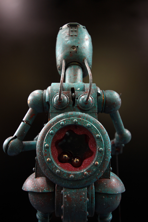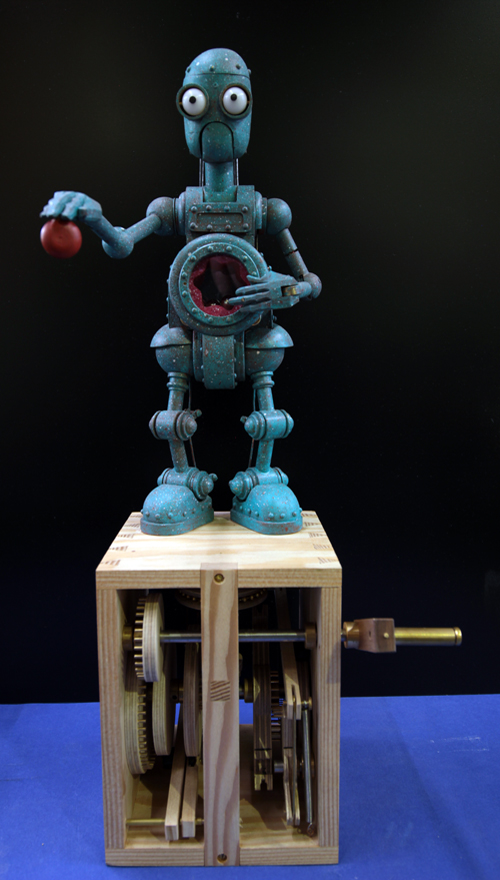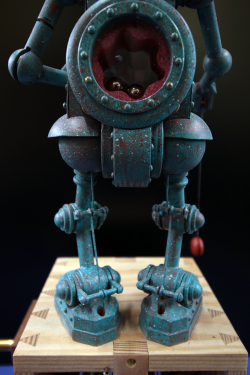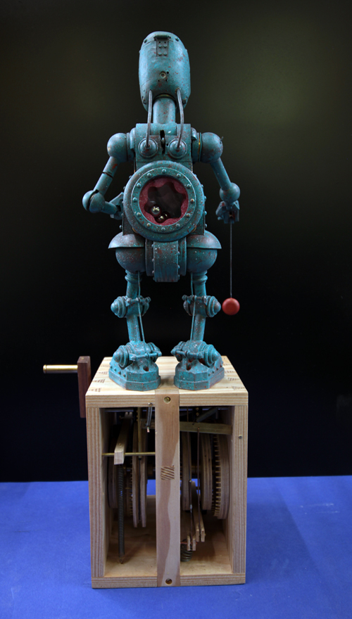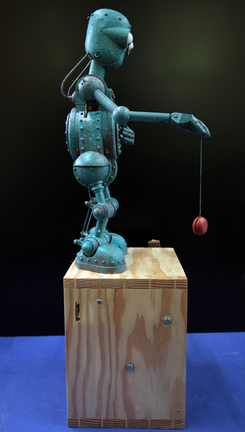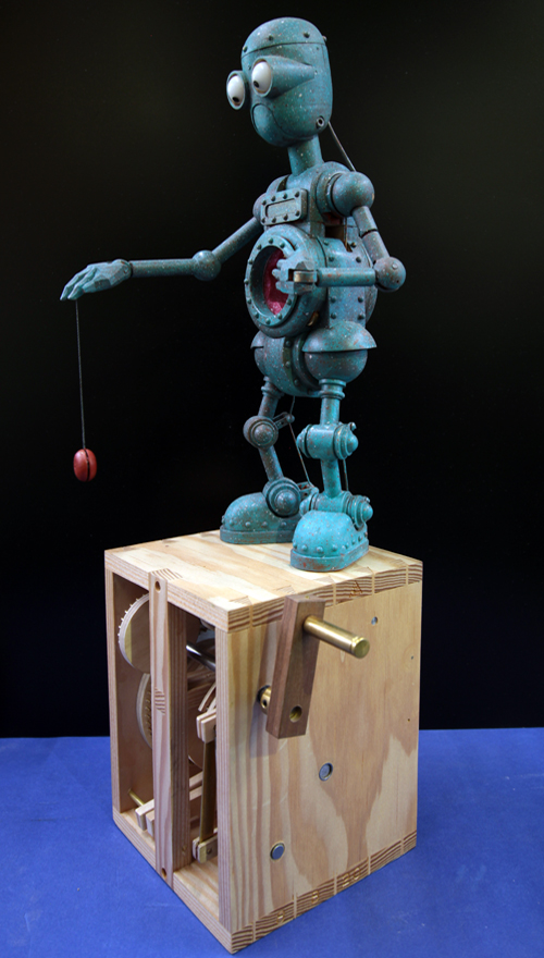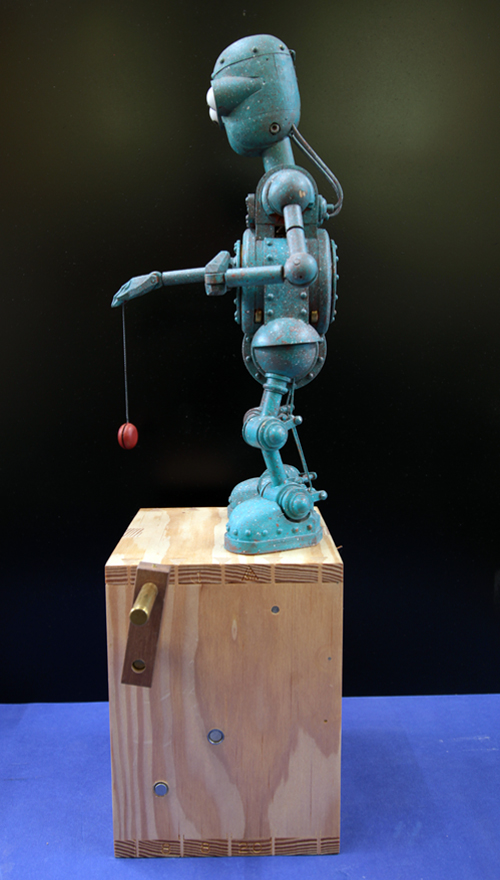 RETURN OF THE MOJO Here we have a return visit to the robot "Borborygmus" , this time with his legs and a few upgrades to his bodywork . He is multitasking , playing with a Yo-yo and rubbing his tummy at the same time ( he is always hungry ) . He follows the Yo-yo with his eyes as it goes up and down , and the ball bearing in his tummy rattle as it rotates . He has an unusual drive mechanism as the chain that drives him runs up his legs and is made from ball chain . The automata is 130 mm x 140 mm x 400 mm high and is made from the usual range of materials . The price is £ 1,550.00 + shipping ( at cost ). The edition is 25 maximum. VERY SORRY SOLD OUT However , I do make a few extra in case any go missing or are damaged in transit. There are 4 extra of this edition . They will be available if none go missing on route . You can add you name to the list for one of these but there are on guarantees you will get one , sorry . Click Here is a link to a video of it working NB: As usual the photos are of the prototype the final version will be much nicer |