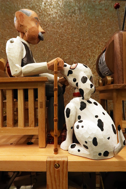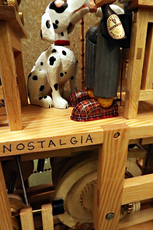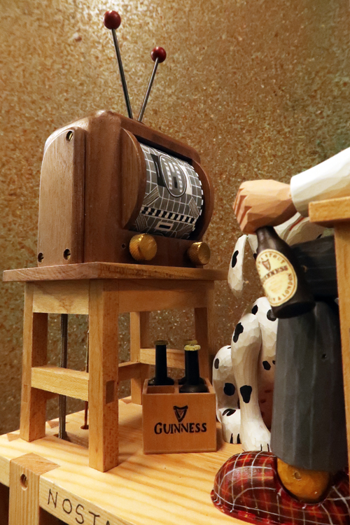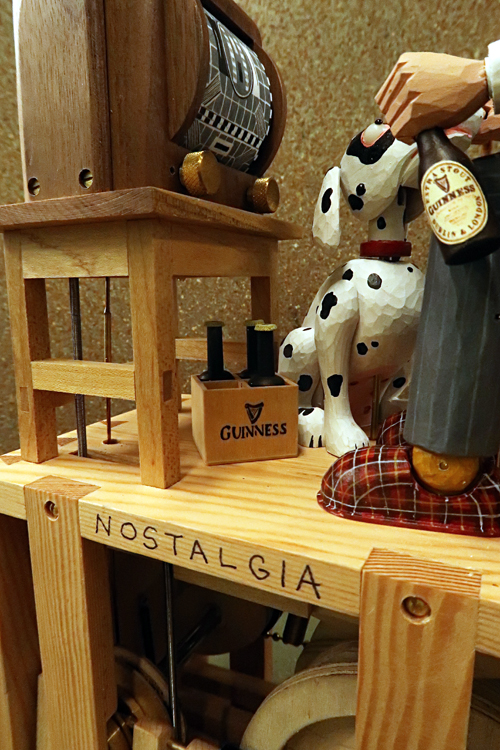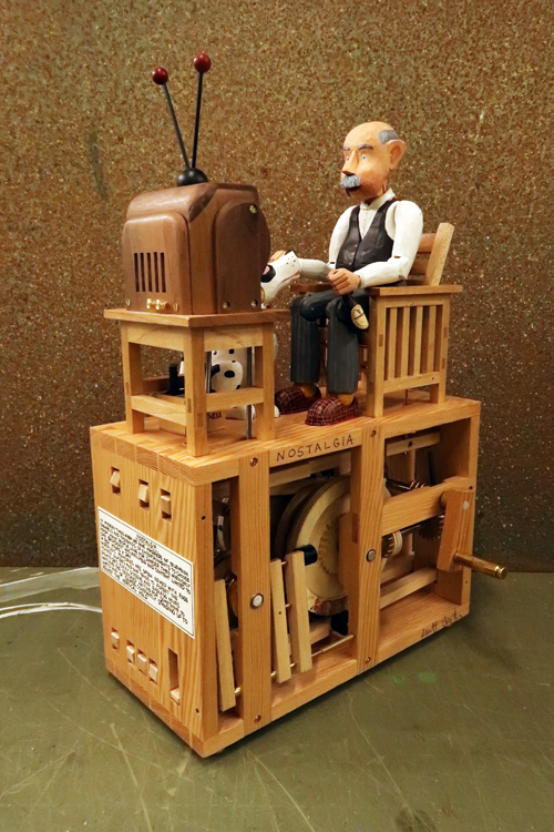 | N"Nostalgia" Hello Everyone ,This is the new edition from The Fourteen Balls toy Company it's called "Nostalgia" This is the Largest automata for some time and has a long sequence and is somewhat complicated To see it working you can clik on the video links at the bottom of the page . It is designed and made dy me ( Matt Smith ) and the painting is done by me and also Sarah ( my wife ). Everything including the labels and tv screen are all hand painted . The Automata is made from various materials including Dogulas Fir for the box , Maple for the furniture and mechanism , Black walnut for the televison and Lime wood for the man and dog. Other materials are : Brass , stainless steel , bronze , Delrin and the string is Dynabraid . It's a fairly big machine being 350 MM high , 220 mm wide and 110mm deep (14" x 9" x 4.5" ). The mechanism has two clutches and various different gearing systems along with the usual Cams , levers , pushrods and pulleys to produce a complex series of movements . The Photos and the video are of the prototype , the finished version may have minor changes . The Price is £1,850.00 ( GBP) + shipping at cost SORRY SOLD OUT Video 1 Video 2 Video 3 |