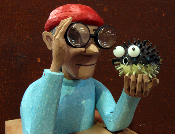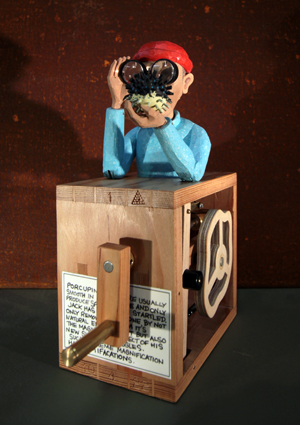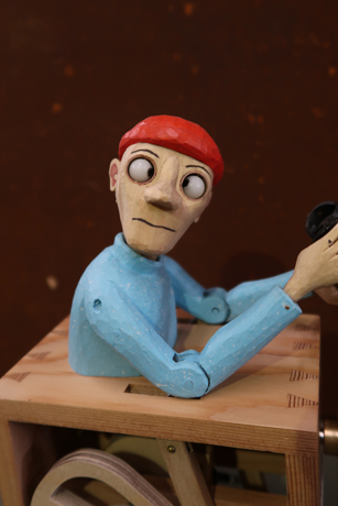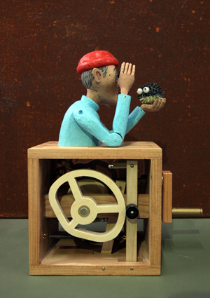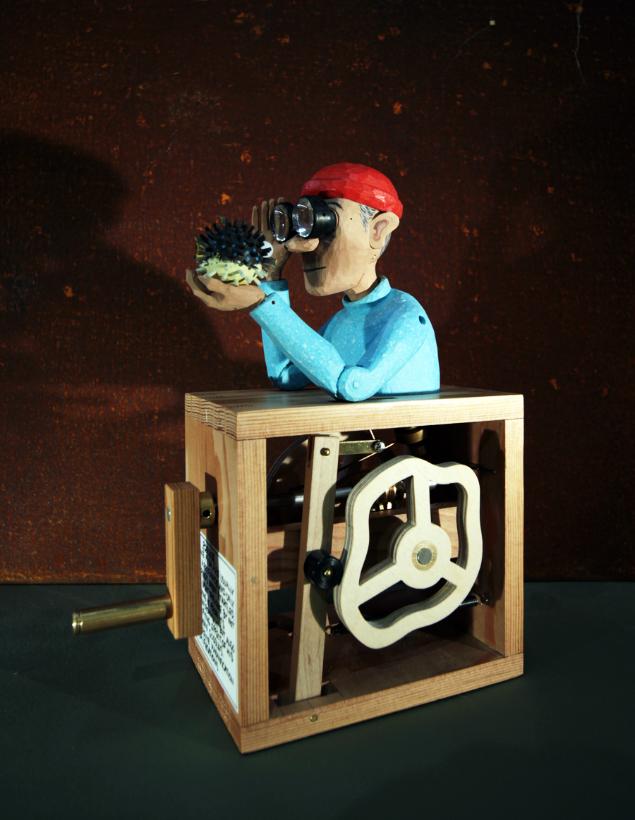 have the latest edition from Fourteen Balls. Designed and made by Matt Smith . It's loosely based on Jacques Cousteau and the finished version may well look a bit more like the man hinself . ( this is as usual the prototype and is a bit rough around the edges ). He is all carved by hand and everything is produced by me in my workshop including all the gears . The automata is made of Douglas fir , Lime wood , Birch , Maple , Brass , Stainless steel and the odd bit of bronze and delrin . He is painted with several coats of Gesso and finished with Liquitex acrylic paint. The size is 160mm x 80 mm x 220mm . To view the action please click on the video link below . VIDEO1 VIDEO2 The price is £599.00 + delivery SORRY SOLD OUT NB : These will be made to order only for delivery in spring 2023 |