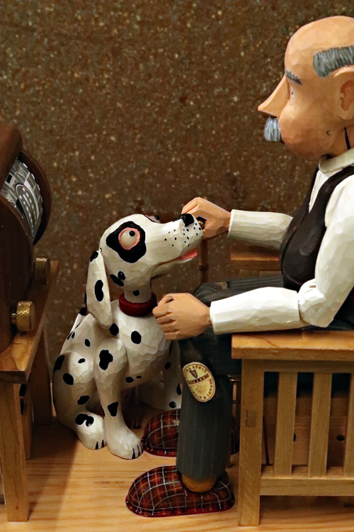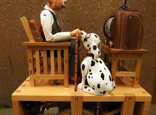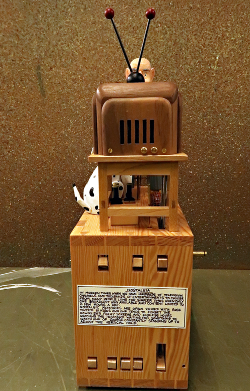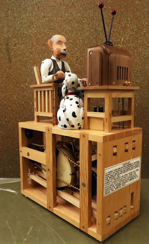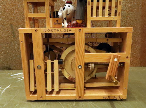 | N"Nostalgia" Hello Everyone ,This is the new edition from The Fourteen Balls toy Company it's called "Nostalgia" This is the Largest automata for some time and has a long sequence and is somewhat complicated To see it working you can clik on the video links at the bottom of the page . It is designed and made dy me ( Matt Smith ) and the painting is done by me and also Sarah ( my wife ). Everything including the labels and tv screen are all hand painted . The Automata is made from various materials including Dogulas Fir for the box , Maple for the furniture and mechanism , Black walnut for the televison and Lime wood for the man and dog. Other materials are : Brass , stainless steel , bronze , Delrin and the string is Dynabraid . It's a fairly big machine being 350 MM high , 220 mm wide and 110mm deep (14" x 9" x 4.5" ). The mechanism has two clutches and various different gearing systems along with the usual Cams , levers , pushrods and pulleys to produce a complex series of movements . The Photos and the video are of the prototype , the finished version may have minor changes . The Price is £1,850.00 ( GBP) + shipping at cost SORRY SOLD OUT Video 1 Video 2 Video 3 |